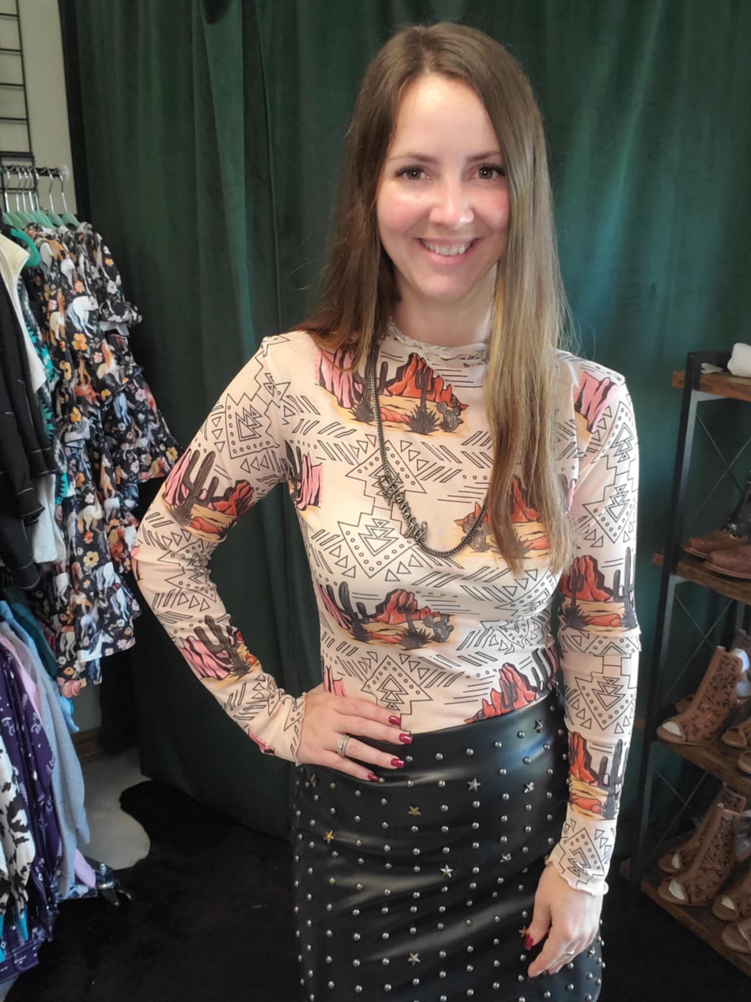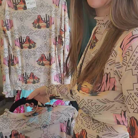 The high neckline and long sleeves give it a sleek silhouette, while the bold print channels rugged Western vibes with modern fashion appeal.