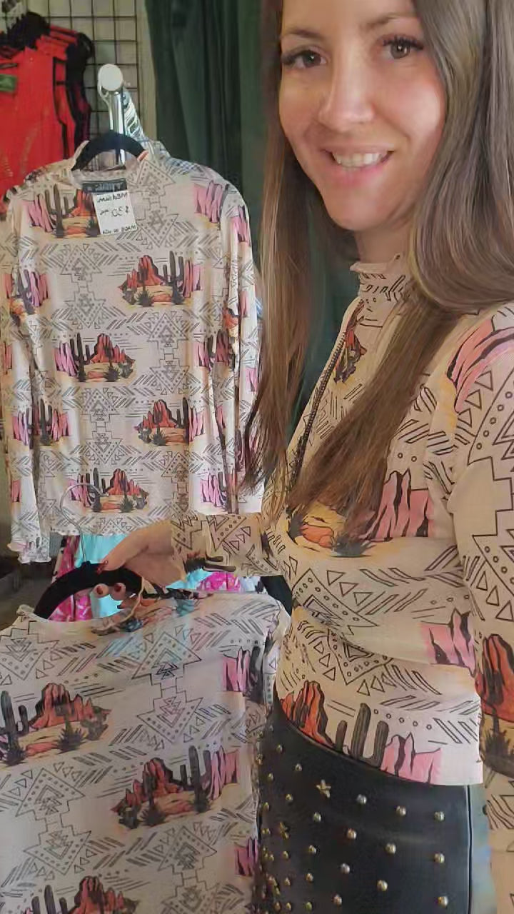 Crafted from soft, stretchy sheer fabric, this fitted tee features an artistic Western desert landscape complete with cacti, rock formations, and tribal-inspired motifs in sunset hues of terracotta, ivory, blush, and charcoal.