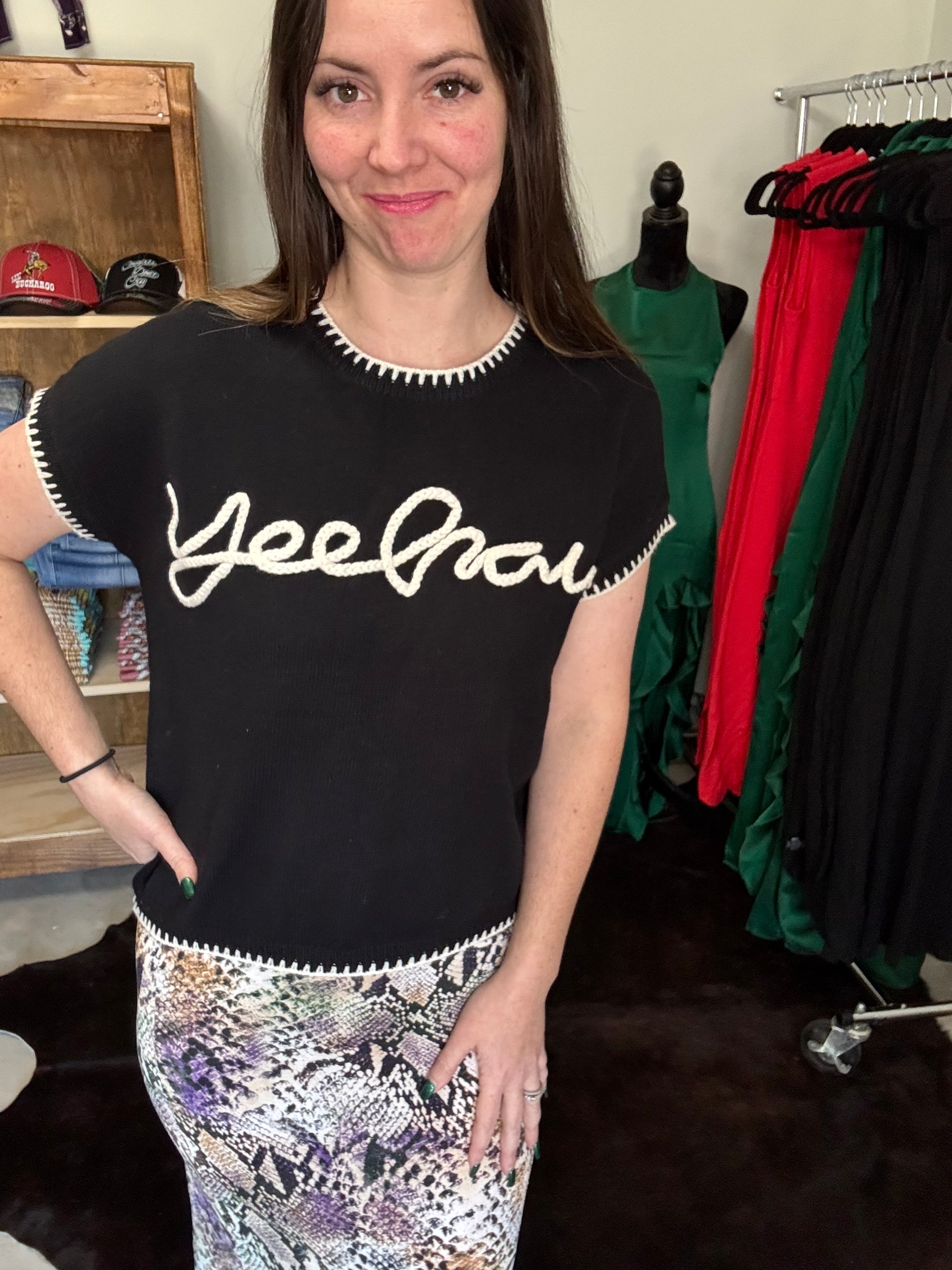 The bold YEEHAW lettering across the front gives it that fun western statement, while the white contrast stitching along the neckline, sleeves, and bottom hem adds a clean, eye-catching detail.